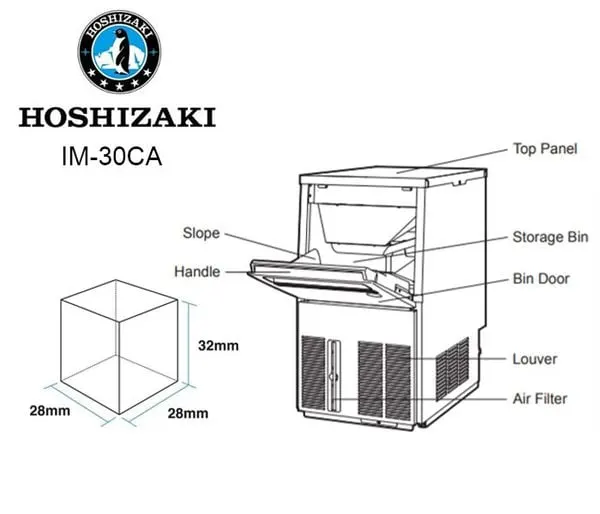 Máy làm đá viên Hoshizaki IM-30CA là dòng máy chuyên dụng công suất 30kg/ngày, cho chu kỳ làm đá nhanh 21 phút/mẻ và kích thước viên đá chuẩn 28x28x32mm.